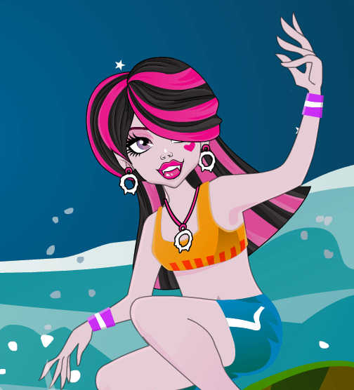 Con el sol que esta haciendo últimamente la gente esta empezando a ir a las playas para ponerse morenos y para practicar un poco de deporte. En este juego de Monster High donde Draculaura es la protagonista, quiere que la gente vea que es una estupenda surfista. Ella siempre va muy bien conjuntada con su tabla de surf, y los complementos que se pone son súper chidos. Seguro que cuando la ayudemos a ponerse los nuevos modelos de playa, estará encantada con lo que le hemos elegido.