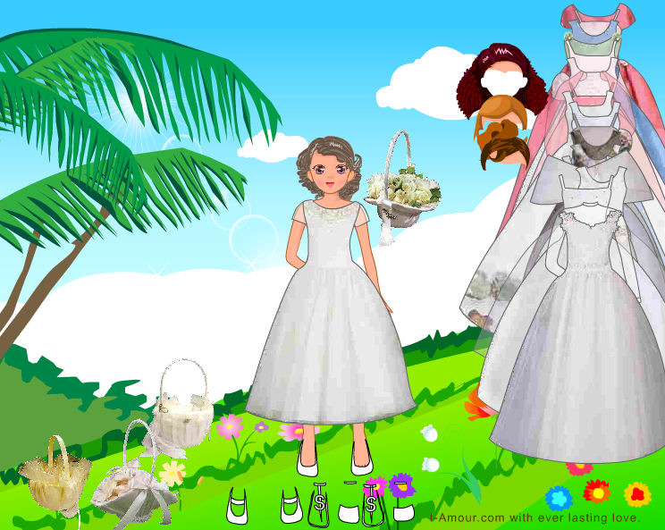 En este juego podrás vestir a esta niña para que celebre su ceremonia de la primera comunión. Dispones de muchos trajes y vestidos blancos o rosas como si fuese una novia, zapatos, cestos de flores y podrás elegir el estilo de peinado con varias pelucas.