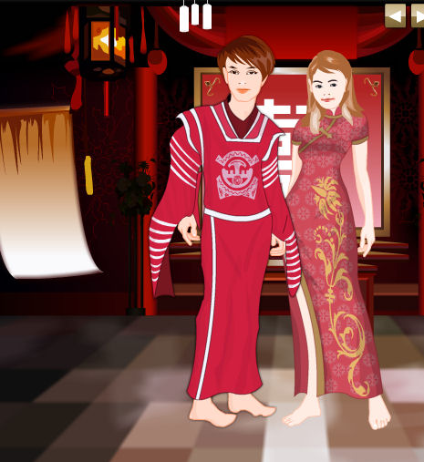 En este juego podrás vestir a los novios con ropa y trajes para una boda oriental. Elige los vestidos para la novia y el traje para el novio, y disfruta de una auténtica boda china para esta pareja. Como comprobarás, los trajes chinos de bodas son muy originales y bonitos, y los novios se quieren de por vida tras darse el «sí, quielo» y jurarse amor eterno en los bueno y lo malo.