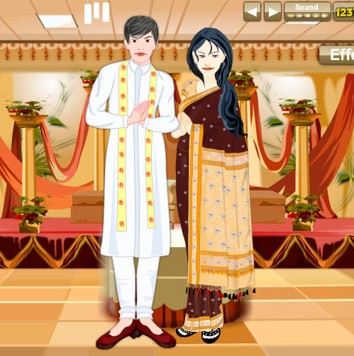 Vestidos, ropa y peinados para esta pareja de novios indios. Antes de que estos novios puedan casarse en su boda, tendrás que ayudarles a vestir con moda india y elegir el estilo de peinado con una sesión de peluquería. Las bodas indias son espectaculares, tienen muchos ritos que cumplir y existen muchas tradiciones que deben ejecutarse, pues ellos son muy mirados para estas cosas. Disfruta de esta boda hindú como si fuese sacada de una películas de Bollywood.