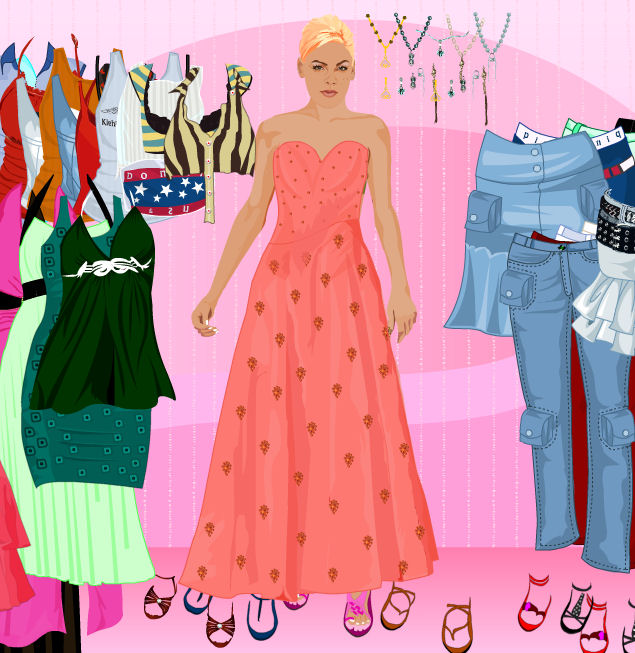 La cantante Pink quiere que seas su estilista en este juego de vestir. Podrás ponerle la ropa y accesorios que quieras a la cantante de grandes éxitos como So What, Raise Your Glass o Just Give Me a Reason, que quiere estar linda para sus fans cuando vayan a verla a sus conciertos. Dispones de pantalones vaqueros y de tela, faldas, sueters, tops, camisetas y accesorios como joyas (pendientes y collares) o zapatos. Después de haber arreglado a Pink, a la que también puedes cambiar el color de su pelo haciendo click sobre él, podrás escribir tu nombre y pintar el fondo del escenario para terminar de arreglar todo el escenario a tu gusto. Seguro que Pink te lo agradece enormemente y pronto te llamará para que sigas asistiéndola con tu buen gusto a la hora de vestir.