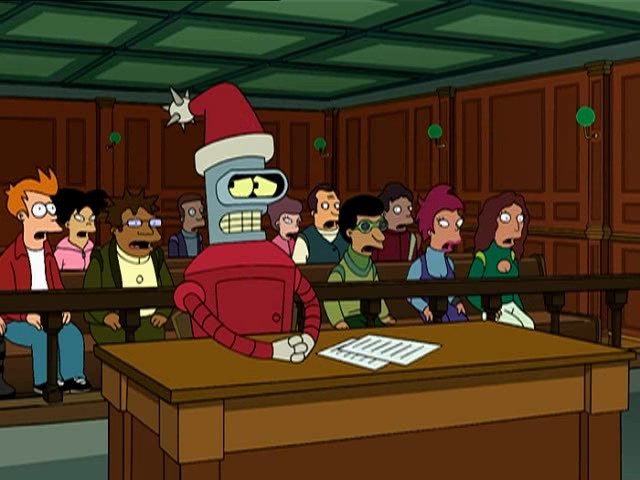 Este es un Momento Futurama perteneciente al capítulo especial navideño “Historia de dos Santa Claus” en el que Bender es acusado en un juicio por ser simplemente Santa Claus.