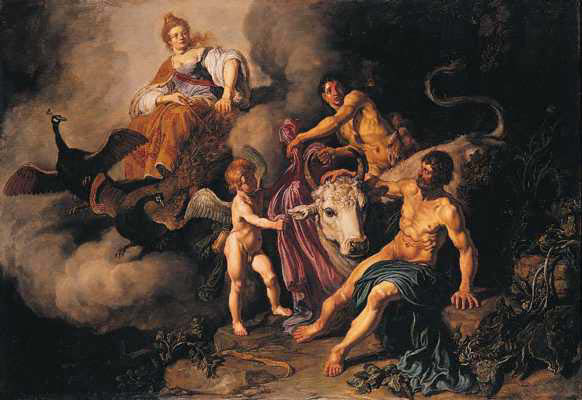 Extrañada Juno ante este fenómeno, descendió a la tierra, disipó una nube y descubrió a la ninfa que acababa de ser transformada en vaca. Pero como conservaba aún bajo la nueva forma sus gracias y encantos, Juno, fingiendo que le placía en extremo, pidió a Júpiter con tan vivas instancias que le fuera concedida, que el dios no se atrevió a negarse a tal petición.