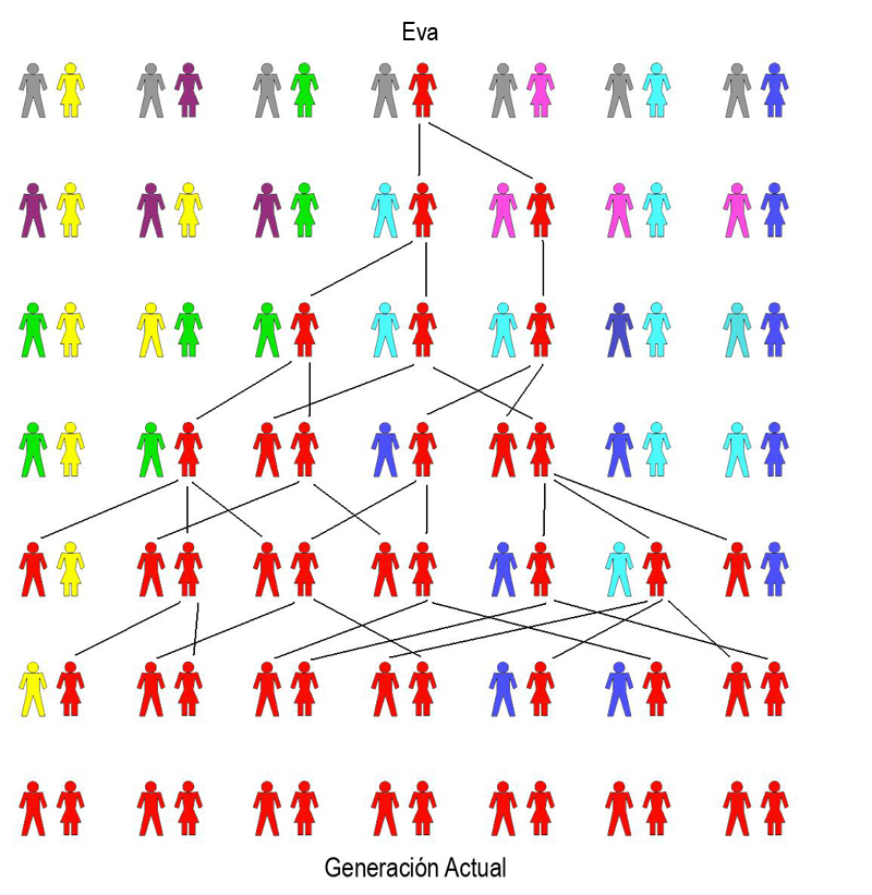 Si realizáramos esta operación con una muestra lo bastante amplia de individuos de distintas etnias, podríamos elaborar un árbol genealógico de toda la humanidad. En la base de dicho árbol se encontraría la antecesora común más reciente de la que todos los seres humanos hemos heredado el ADN mitocondrial. A esta mujer, que debió existir en carne y hueso, se le ha otorgado el nombre de Eva mitocondrial.