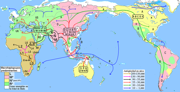 Migraciones del ser humano por todos los continentes utilizando la información del ADN mitocondrial, que al heredarse por vía materna, permite examinar las líneas matrilineares humanas hasta sus orígenes.