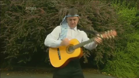 Mientras las víctimas esperan, aparece un chico con pinta de macarrilla (yo juraría que es el Luisma de Aida XD) y cogiendo sin permiso la guitarra, se pone a tocarla con mucha pasión. No contento con esto, parece que le entra un arrebato rockanrolero y destroza a golpes la guitarra ante la sorpresa de las víctimas, que descubren lo mal celadores que son.