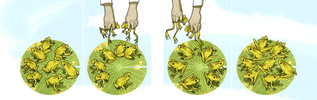 No has necesitado varita mágica. No has necesitado magia de ningún tipo. Lo que tenemos aquí es el proceso denominado cría selectiva. Se basa en el hecho de que las ranas varían unas de otras y de que dichas variaciones tienden a ser heredadas, es decir, transmitidas de padres a hijos a través de los genes. Simplemente seleccionando cuáles son las ranas que hay que criar y cuáles no, podemos crear un nuevo tipo de rana.