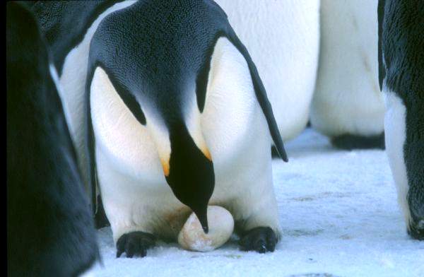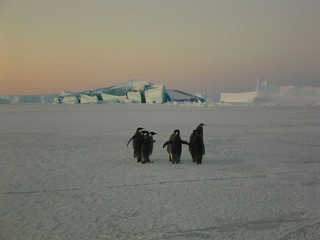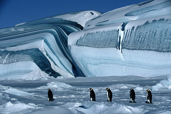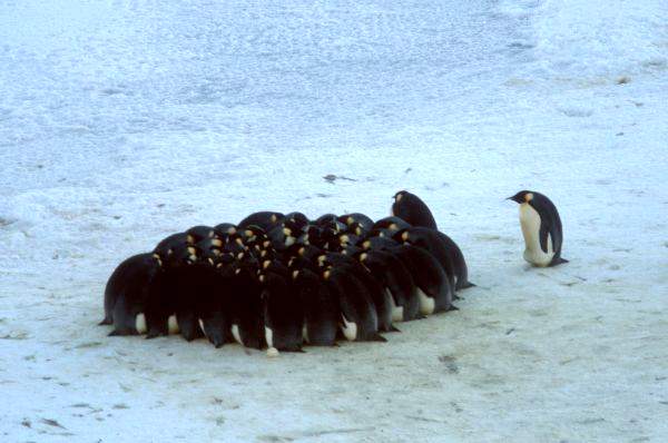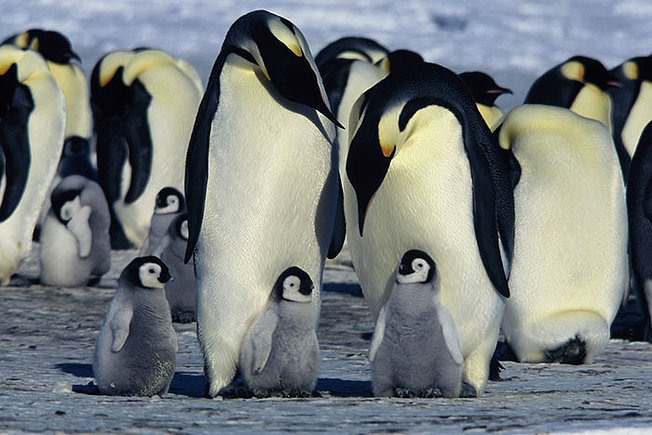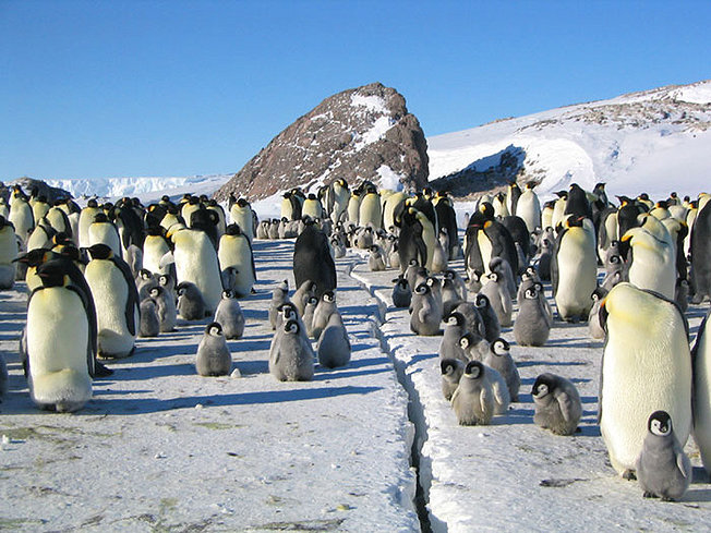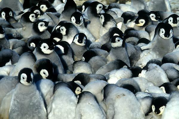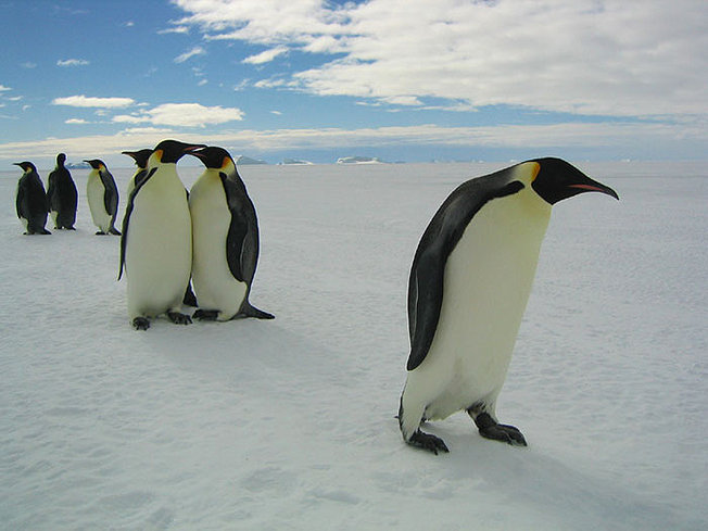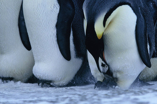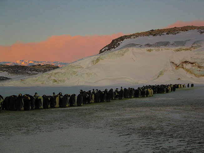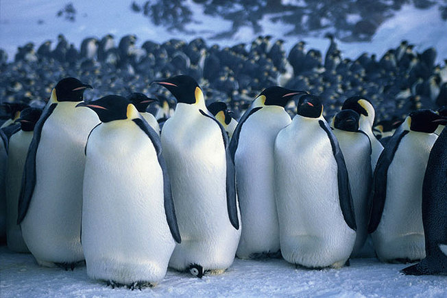 Se puede observar a los pingüinos emperador caminando kilómetros y kilómetros de camino tortuoso y nival, protegiéndose mutuamente de vientos que superan los 150 km. por hora y temperaturas que rozan los 70 grados bajo cero.