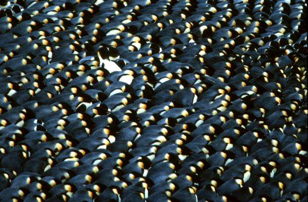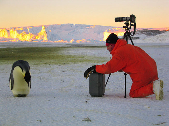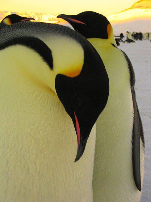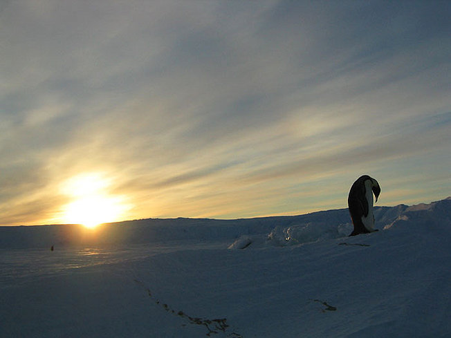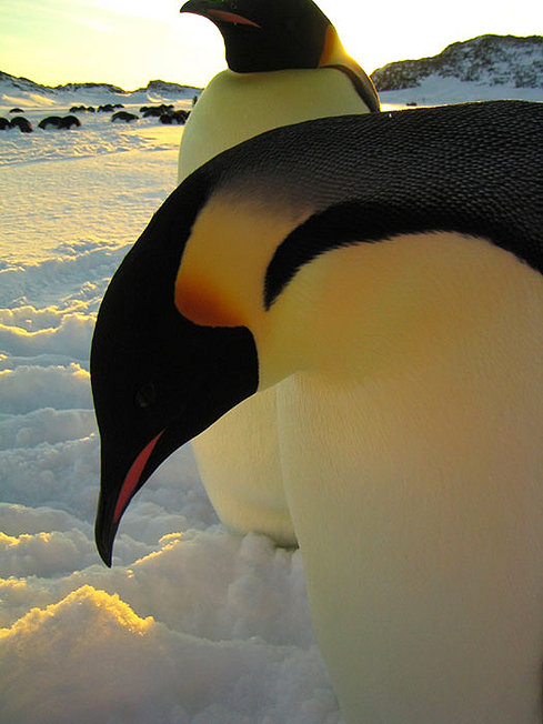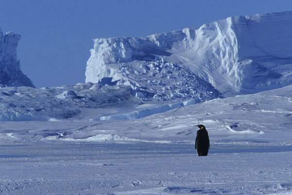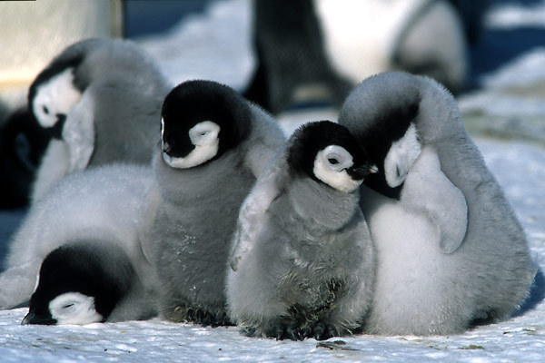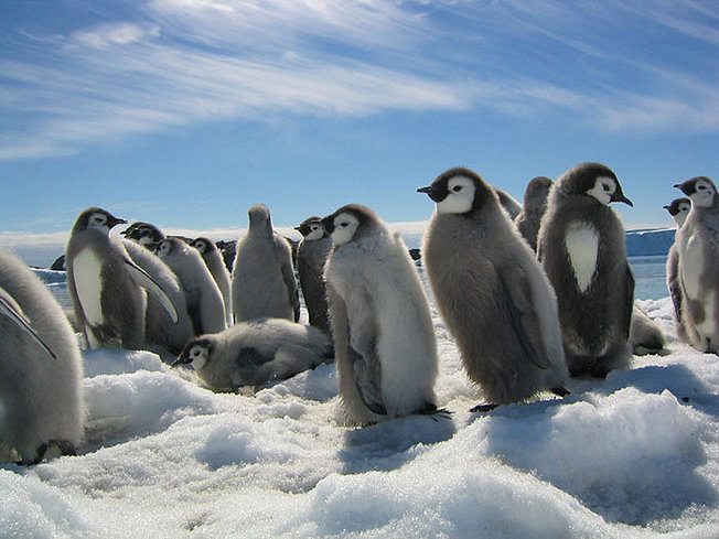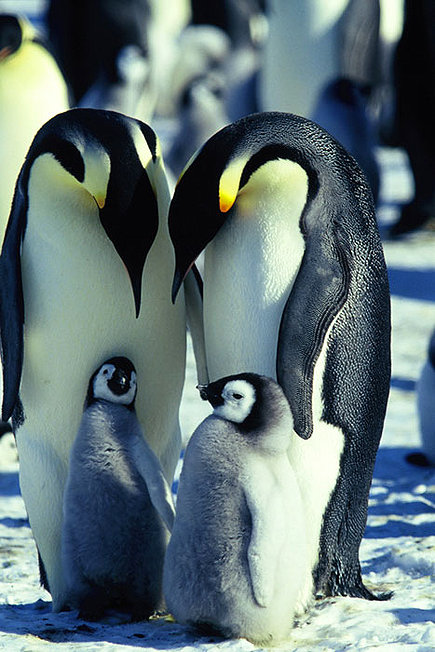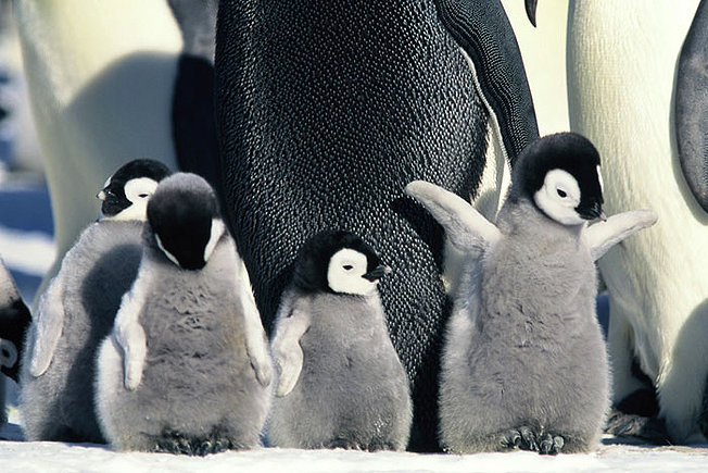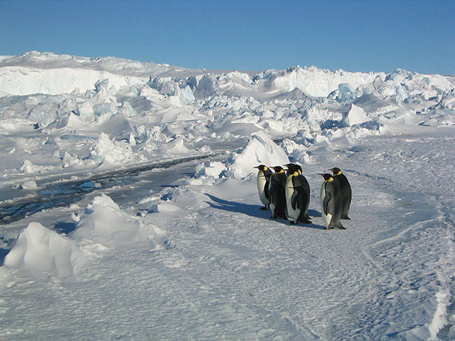 Se puede observar a los pingüinos emperador caminando kilómetros y kilómetros de camino tortuoso y nival, protegiéndose mutuamente de vientos que superan los 150 km. por hora y temperaturas que rozan los 70 grados bajo cero.