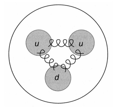 En la imagen anterior, los muelles representan los gluones intercambiándose entre quarks. En realidad, el interior de un protón es un mundo enormemente complejo y dinámico, donde los gluones intercambiados interaccionan también entre ellos, y además pueden producir pares quark-antiquark, que se recombinan de nuevo en gluones. A veces se visualiza un protón como un saco que contiene no solo los tres quarks uud, sino también gluones y pares quark-antiquark.