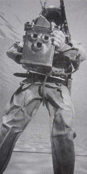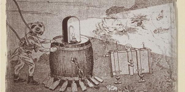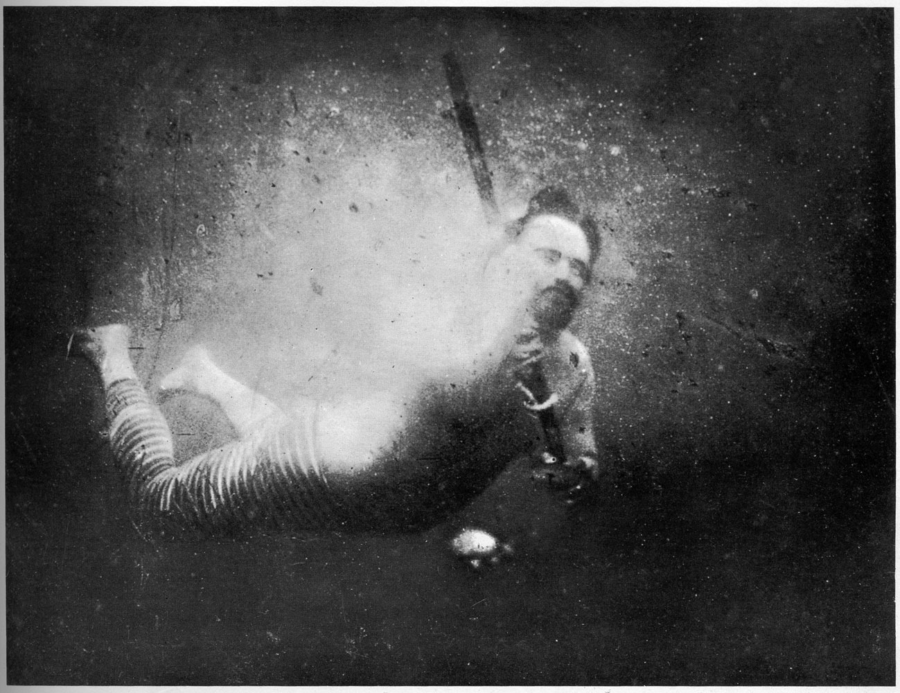 Louis Boutan fue el primer fotógrafo submarino, el cual tomó las primeras imágenes debajo del mar en 1893 a una profundidad de 50 metros. En esta foto podemos ver un autorretrato en el que Boutan aparece con su traje de buzo, tubos de aire y escafandra. Fue su primera fotografía con éxito y nos da una idea de lo engorroso que era realizar inmersiones (y por supuesto tomar fotos en un medio marino) en aquellos tiempos.
