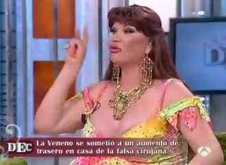 La Veneno narra que se puso silicona en la retaguardia porque su marido, el italiano con el que estaba por aquel entonces, le acomplejó. A Paca La Piraña le puso un litro y medio en cada pecho. Pues a La Veneno le puso un cuarto, que costaba 25.000 pesetas de la época.