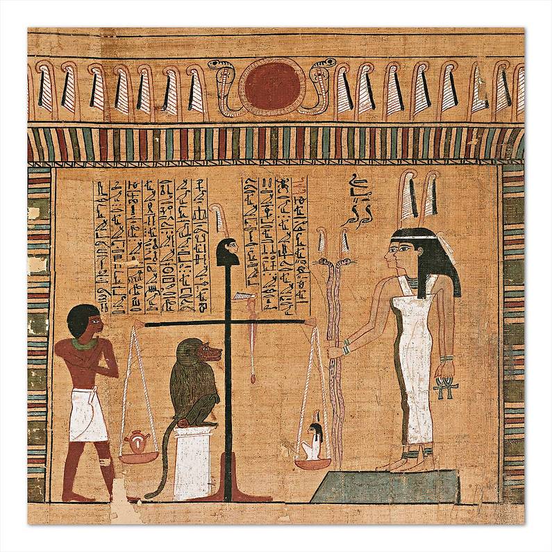 Mediante la sicostasia o «pesada del alma», el difunto se sometía al juicio póstumo en la «Sala de los dos Maat». En la balanza, el corazón, receptáculo de la conciencia, era contrapuesto a Maat, diosa de la verdad y la justicia, hija de Ra y garante del orden universal. Para acceder al más allá, debía existir un equilibrio en la balanza.