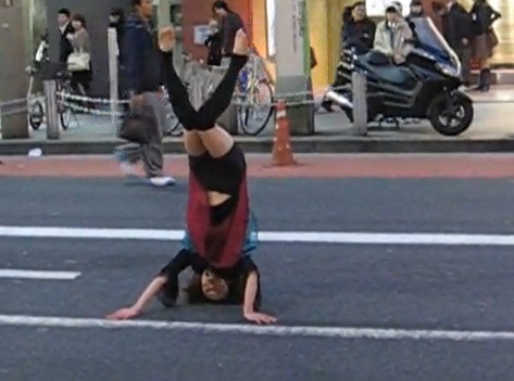 En realidad, ésta chica es una bailarina que se dedica a actuar en el barrio de Shinjuku (cuando lo cierran los domingos), en Tokyo. Su forma tan libre y enérgica de bailar es todo un espectáculo, y a ella le encanta asustar y sorprender a la gente o turistas que pululan por allí. Una muestra de la diversidad cultural que se puede encontrar en Tokyo.