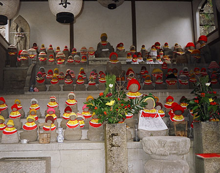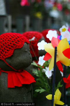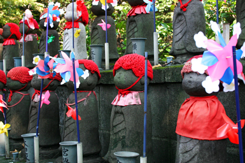 El templo Zojoji en Tokio se dedica a la memoria de aquellos niños que no tuvieron derecho a sepultura bien por morir dentro de la madre o bien por nacer ya muertos. Estas pequeñas estatuillas jizo se adornan de colores, con gorros, flores y molinillos de viento por todo lo que no terminó con la muerte del bebé: los sueños, los ratos dedicados a ellos, los sentimientos creados incluso antes de nacer, los nombres que ya no se pondrán. Las madres suelen ir a rezar a los jizos por sus hijos perdidos.