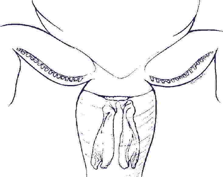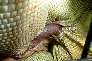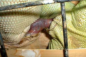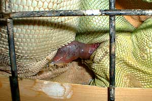Podemos ver dos bultos en la parte inferior de la cola cuando el pene se encuentra retraído y a veces podemos verlo fuera cuando la iguana se encuentra deposicionando. También en raras ocasiones, el pene se queda en el exterior en lo que se llama prolapso.