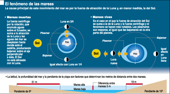 Durante la luna nueva y la luna llena, cuando las mareas se la Luna y el Sol se refuerzan, tenemos las llamadas «mareas vivas». En los cuartos lunares, las dos fuerzas se hallan descompensadas y tenemos mareas altas más bajas, las llamadas «mareas muertas».