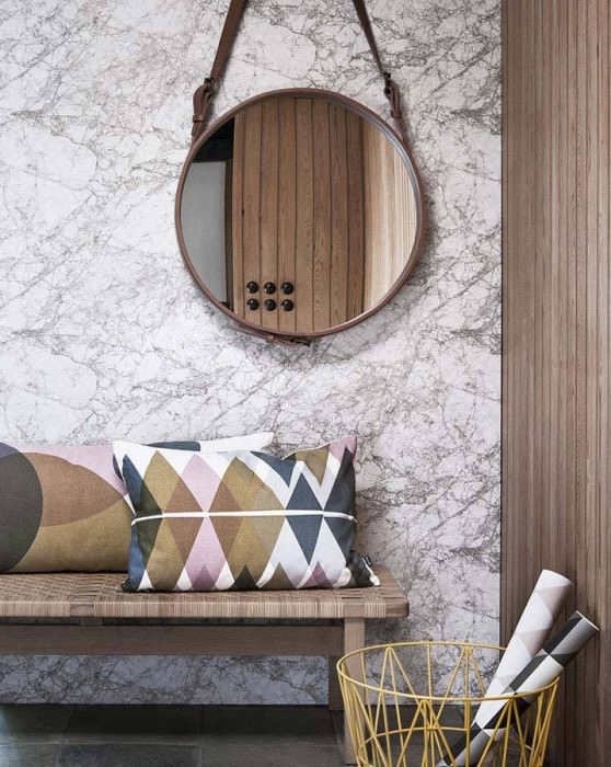 Ya que en las reformas están de moda el mármol y el terrazo como materiales de construcción, era lógico que el papel pintado imitara estos elementos más pronto que tarde. Su punto fuerte es la elegancia que consigue imprimir a cualquier sala a través de sus formas, colores y texturas de piedra. También nos sirve para ahorrar dinero al lograr un efecto parecido sin tener que emplear esos costosos materiales, logrando que nuestras paredes luzcan de una manera única y original.