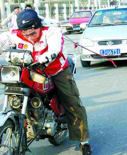 Entre llantos, Lianhai consiguió mover el coche y se paró al llegar al final de la calle. “Aunque a pie es más seguro, prefiero tirar del coche usando una moto, lo que requiere más habilidad”, comentó.
