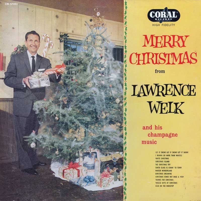 Merry Christmas from Lawrence Welk and his champagne music (me pregunto de dónde viene lo de música champán). Este disco publicado por Coral Records fue grabado en alta fidelidad, aunque lo mejor es cuando le hicieron sonreír a Lawrence para hacerle la foto, mientras miraba hacia arriba como un niño bueno. Me recuerda a las fotos de comunión, que te hacen mirar hacia arriba como si así estuvieras comunicándote mejor con el niñito Jesús.