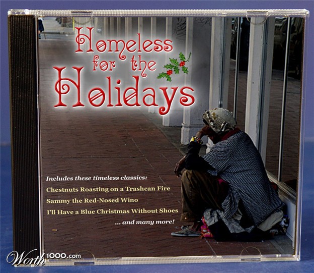 Homeless for the holidays. Hay que tener mala folla para realizar esta portada y reírse de los sintecho. Dice que incluye los éxitos atemporales: «Las castañas se están asando en el fuego», «Sammy, el borrachín de nariz roja» o «Tendré una Navidad triste sin zapatos».