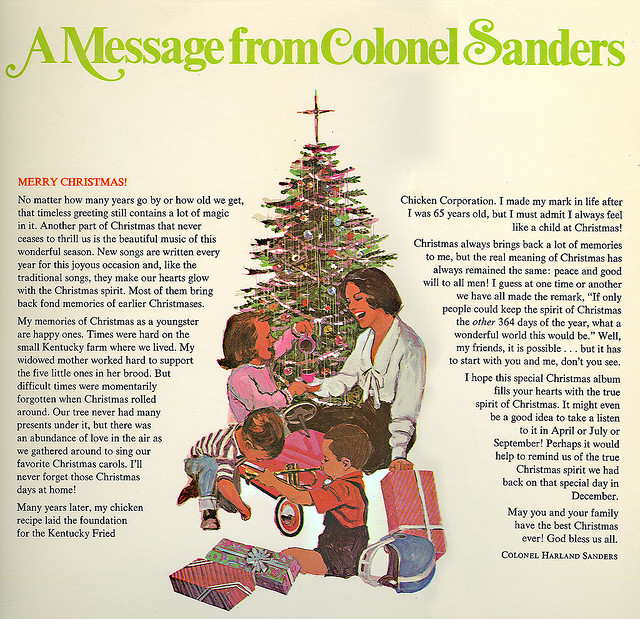 Christmas with Colonel Sanders. Y es que aparte de vender pollo frito, el coronel Sanders también era un enamorado de la Navidad y pretendía ser la competencia directa del Papá Noel de la Coca Cola.