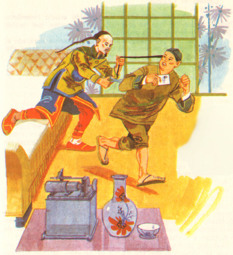 A la derecha, Kin-Fo corriendo tras Sun para cortarle un trozo de coleta, algo que hace siempre que éste se porta mal.