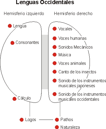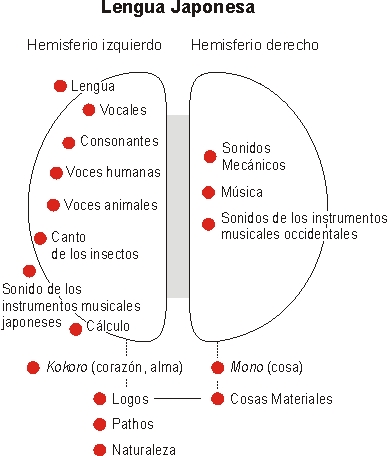 «El mismo proceso explica el predominio, entre los no japoneses, del hemisferio cerebral derecho en lo relativo a los sonidos y funciones relacionados con las emociones. Puede así afirmarse que la lateralidad de la localización de las emociones es algo que se adquiere a través de la lengua materna.