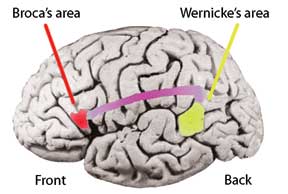 Existen en el hemisferio izquierdo del cerebro tres centros relacionados con el lenguaje (véase el dibujo). En el área de Wernicke se seleccionan las palabras que se hallan acumuladas en la memoria verbal; si se trata de escribir, la orden es enviada a los músculos de la mano. Si se trata de hablar, entra en acción el área de Broca que controla el lenguaje articulado. Cuando entra a participar la vista, el que actúa es el centro conocido como circunvolución angular, que establece un enlace entre el área de Wernicke y la corteza visual.