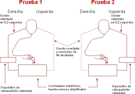 Supongamos que hacemos llegar al oído izquierdo un sonido constante y sincrónico de 40 decibelios y al oído derecho el sonido retardado, aumentando la intensidad de este último, y que la consecuente perturbación se manifiesta a partir de los 55 decibelios, es decir cuando el volumen supere en 15 decibelios el sonido sincrónico. Y sigamos suponiendo que repetimos el experimento invirtiendo los audífonos y que el comienzo de la perturbación se manifiesta al nivel de 75 decibelios, es decir cuando el sonido retardado alcanza un volumen superior en 35 decibelios al sonido constante y sincrónico dirigido al oído derecho.