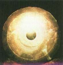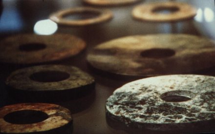 Los discos de las fotografías, se piensa que pueden ser en realidad discos que se enterraban junto a los muertos. Esta costumbre se practicó desde el Neolítico, hasta el periodo de la dinastía Shang, y tenían la función de asistir a los muertos en el más allá. Los más trabajados y con dibujos de dragones, peces o serpientes, pertenecen a un periodo más actual.