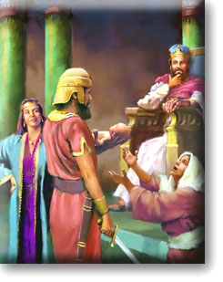 En principio, el soldado pensó que el rey estaba de broma, pero Salomón comenzó a mirar con ira la indecisión del subdito. Lentamente este desenvainó su afilada y brillante espada y avanzó hacia la mujer que poseía el niño. De repente, la verdadera madre se lanzó a los pies del rey y suplicó: