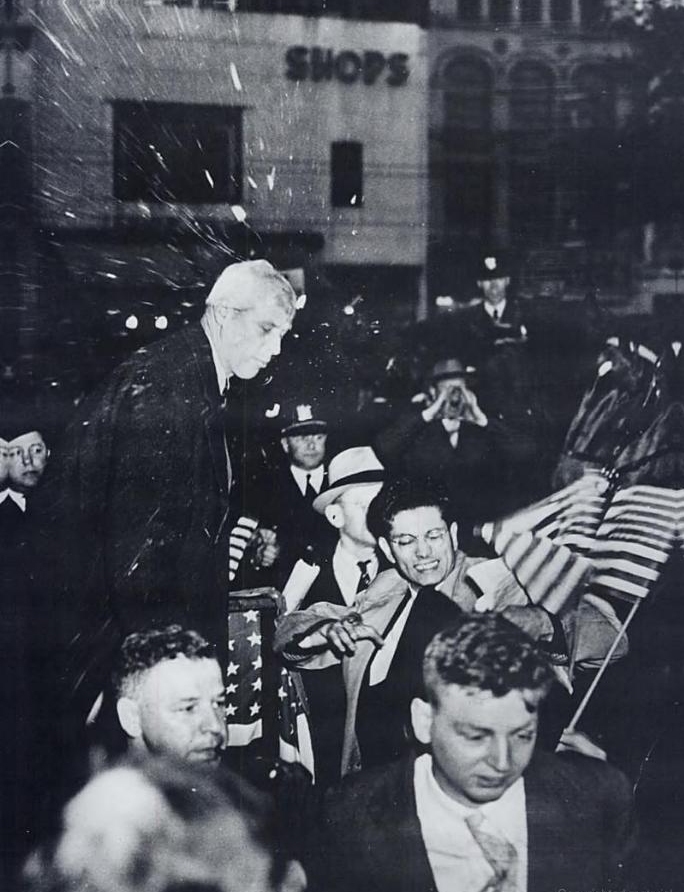 Así es como Thomas recibió una lluvia de huevos podridos y verduras durante el discurso en que atacaba el eterno caciquismo del alcalde Frank Hague, de Nueva Jersey.