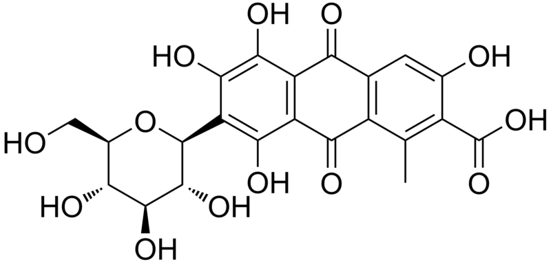 La estructura química del ácido carmínico consiste de un núcleo de antraquinona enlazado a una unidad de glucosa.