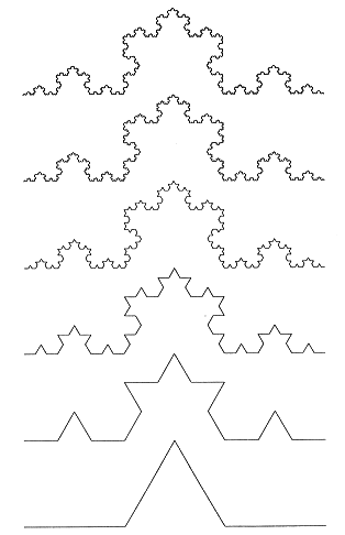 Si observamos cualquier fragmento de este sistema a cualquier nivel de magnitud, contemplaremos lo mismo: una linea recta con triángulos en ella. Es obvio que también existe una conexión entre el aspecto de las cosas a distintas escalas de aumento.