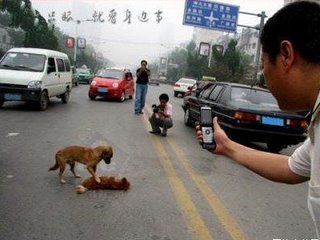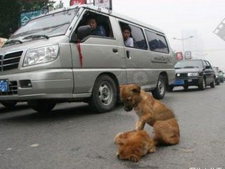 En estas imágenes podéis ver un perro que vela a un compañero suyo que ha sido atropellado y se encuentra muerto en medio de la carretera. El perro permanecía celosamente junto al cuerpo sin vida de su amigo y lo defendía de la gente que intentaba acercarse.