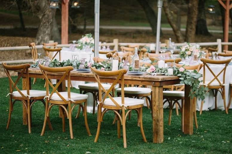 Las sillas cross back casan a la perfección con las mesas de madera, ya que refuerzan ese toque mediterráneo o de campiña inglesa, por lo que, aunque nos pueden servir para cualquier boda, se lucen más en las celebraciones al aire libre.