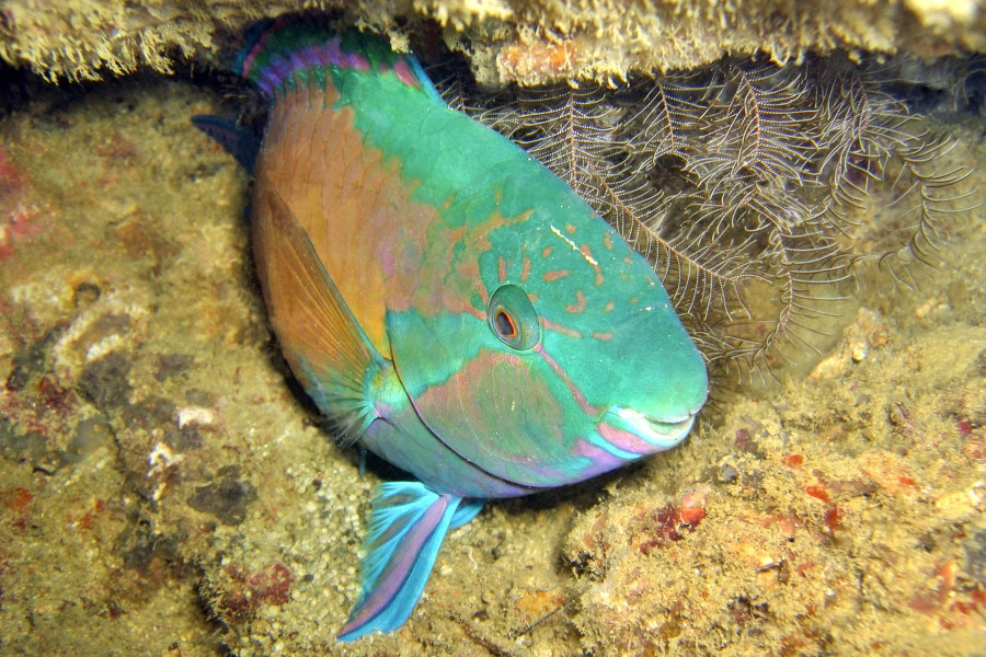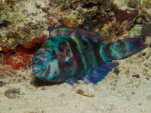 Pez loro durmiendo envuelto en moco.