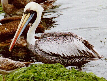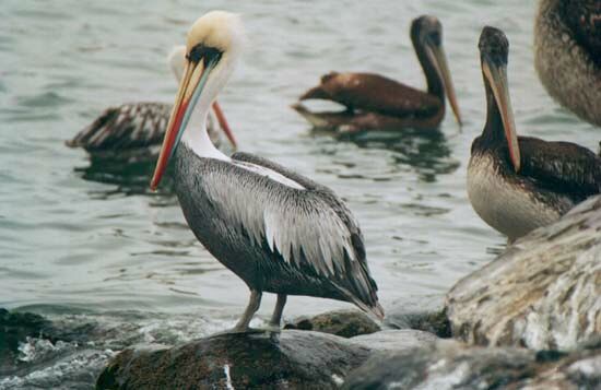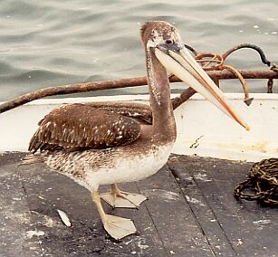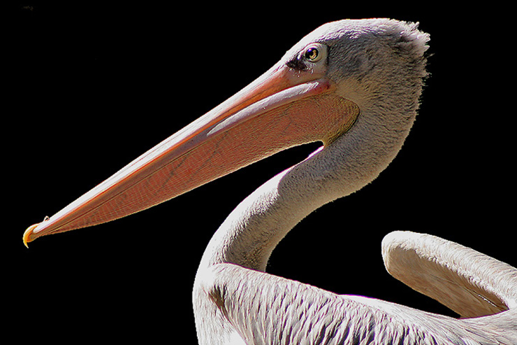 Los pelícanos son aves grandes que poseen un pico largo, ancho y aplastado. Su mandíbula superior acaba en un fuerte gancho que se tuerce hacia abajo sobre el extremo de la mandíbula inferior.