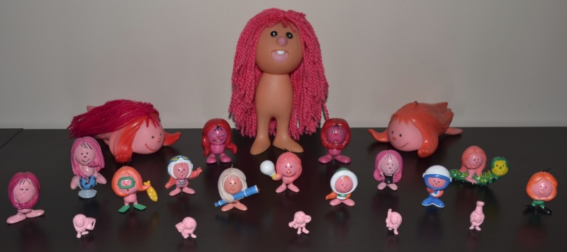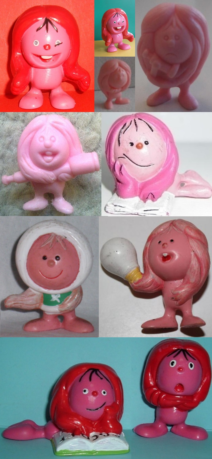 Muñecos de Mim (yo recuerdo haber tenido alguno de estos de plástico de color rosa pálido). Se fabricaron tanto figuras de plástico como muñecos de trapo.
