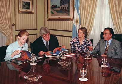 El presidente Menem es un hombre muy agradable. Me sorprendió lo bien que le caí. El helicóptero aterrizó en mitad de una hermosa isla situada en el delta del El Tigre. Cientos de flamencos echaron al vuelo al vernos llegar.
