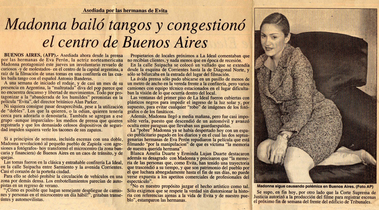 Ayer por la tarde hubo una demostración en mi honor. Todos mis fans se reunieron para marchar desde el Obelisco (un monumento situado en el centro de la Avenida Nueve de Julio) hasta mi hotel. Cuando llegaron, comenzaron a gritar Eva/Madonna, para guardar posteriormente diez minutos de silencio.