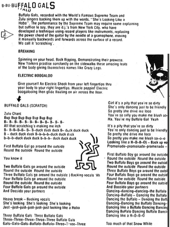 En la funda de «Duck Rock», McLaren escribió que «Buffalo Gals» había sido «grabada con el equipo World’s Famous Supreme Team y cantantes Zulúes acompañando con la frase «she’s looking like a hobo». La interpretación de Supreme Team puede que requiera alguna explicación, pero es suficiente decir que son DJs de Nueva York que han desarrollado una técnica usando los tocadiscos como instrumentos, reemplazando el poderoso acorde de la guitarra por la aguja del gramófono, moviéndola manualmente hacia atrás y adelante a lo largo de la superficie de un vinilo. A eso le llamamos scratching.»