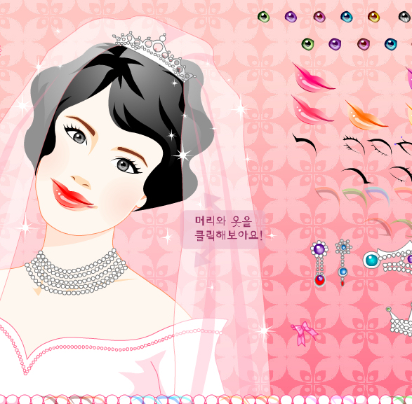 En este juego, aparte de poder vestir a la novia, podrás ser su estilista y la podrás maquillar y peinar. También tienes muchas joyas como gargantillas, collares, diademas, pendientes y adornos como lazos. Para el maquillaje, dispones de lentillas de colores para los ojos, pintalabios para el carmín, sombra de ojos, maquillaje base y rimmel para las pestañas.