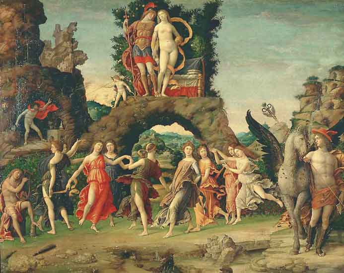 Marte y Venus en el cuadro “Danza en el Parnaso”, de Andrea Mantegna. Data de 1497.