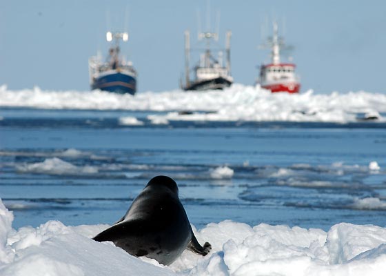 Unos días antes de que se abra la veda, empiezan a llegar los barcos de los pescadores que terminarán con la vida de más de 300.000 focas en las próximas semanas. Aquí vemos a una foca ignorando su destino, mirando a los barcos que se acercan por el horizonte.