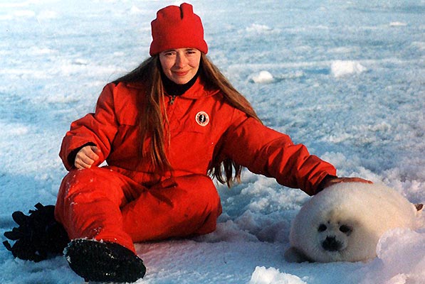 Un grupo de veterinarios que acudió a Canadá, invitado por el Fondo Internacional para el Bienestar Animal, durante el 2001 fue a la cacería e indicó que el 40% de los animales habían sido despellejados estando vivos. En la imagen, Rebecca Aldworth con una de las crías de foca.