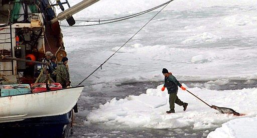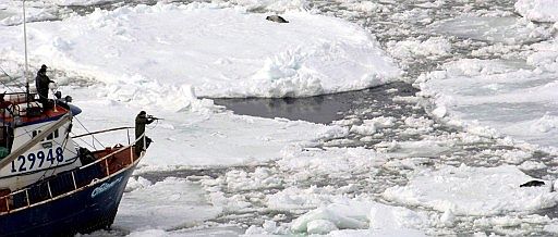 Un barco pesquero canadiense procede a cargar en sus bodegas las pieles de focas arpa cazadas hoy. Las organizaciones ecologistas denuncian que la caza se lleva a cabo para que los pescadores obtengan unos escasos ingresos fuera de la temporada de pesca.