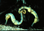 Agarrándose firmemente con la cola sobre un soporte, frota su bolsa contra una concha o roca hasta que salen los jóvenes, con fracciones de sus tejidos internos. No parece cierto que sean los hijos los que producen la rotura de estos tejidos.