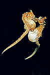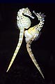 Después de una danza nupcial, en esta posición, la hembra traspasa de su cloaca, con ayuda de una papila genital de unos 3mm. de largo, sus huevos a la bolsa ventral (incubatriz) de los machos, que está recubierta de suave tejido y dispuesta en compartimentos, para mantener cada huevo separado, como en células esponjosas.